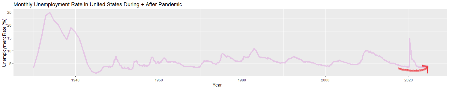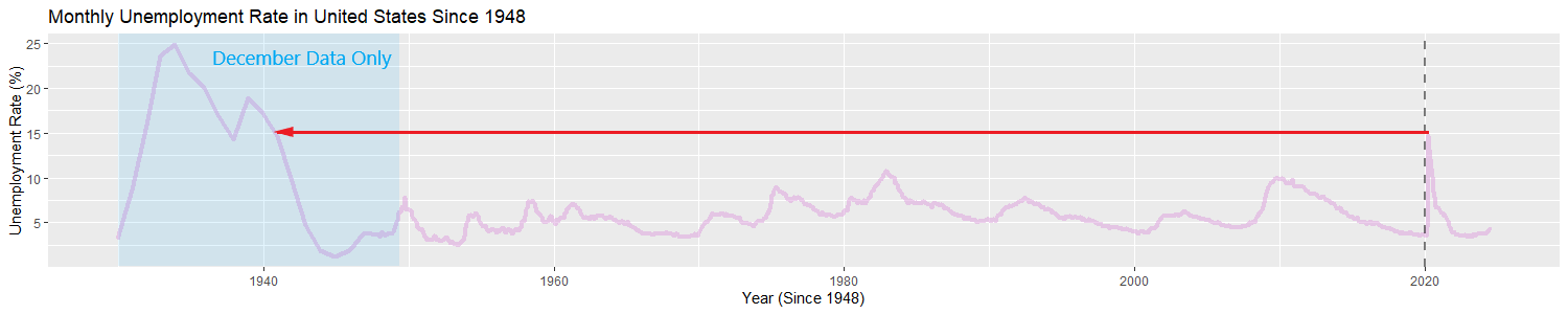 Technically you could extrapolate from this data and estimate that the unemployment rate in April 2020 was last seen in September or October of 1940, but we don’t have that data measured. The last measured data point that was greater than April 2020 came from December 1939. Really, though, that’s just semantics—”Since the Great Depression” is a broad enough statement that we can allow a year or so of give in our graphs.
