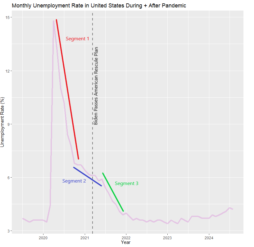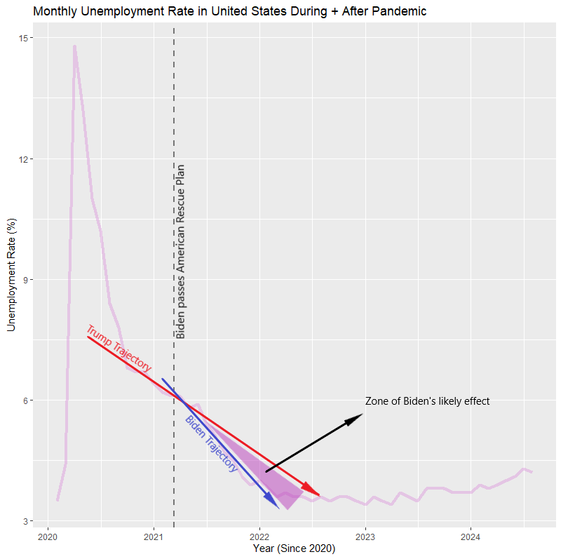 The job increase under the Biden-Harris administration likely wasn’t bounce-back. The strongest evidence for this is that the trajectory of unemployment statistics changed shortly after they passed the American Rescue Plan. The easiest way to see their effect is to look at the extrapolated trajectory from the Trump administration vs. the actual trajectory under the Biden administration.