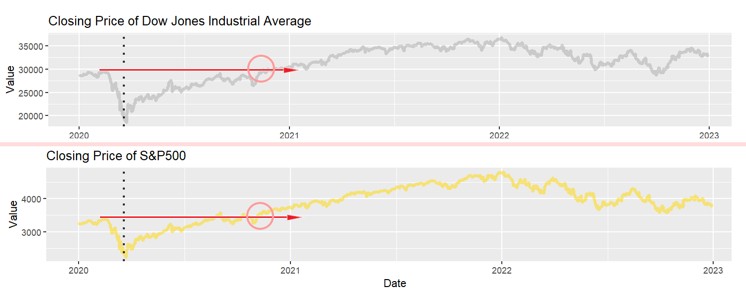 The graph above shows the historic prices of two index funds: the Dow Jones Industrial Average and the S&P 500. The dotted line represents March 19th, 2020, which is when the lockdowns were first implemented in California. The red arrow shows the price of each stock prior to the crash, and the circle shows where the post-Covid price surpassed its pre-Covid high. Note the sharp decline leading up the the lockdowns—that happened when Covid arrived on U.S. soil. The fear and uncertainty spurred caused a stock market crash.