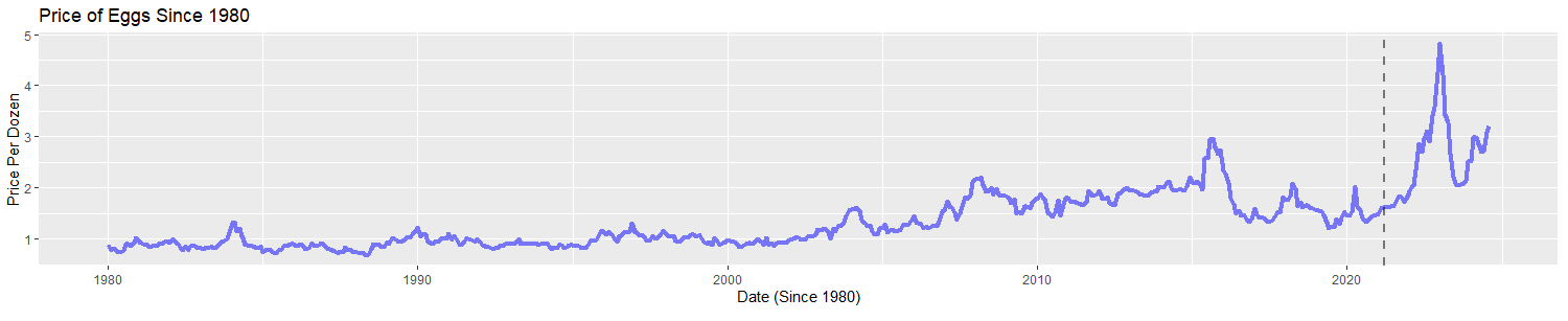 The dotted line in that graph shows the date that Biden’s American Rescue Plan was passed. You can see how shortly afterwards egg prices rocketed. In February of 2020 the average price of a dozen eggs was $1.44. Two years later, in February of 2022, it was $4.21—a 290% increase. In August 2024, the month before the debate? $3.20, a 221% increase over pre-Covid levels.
